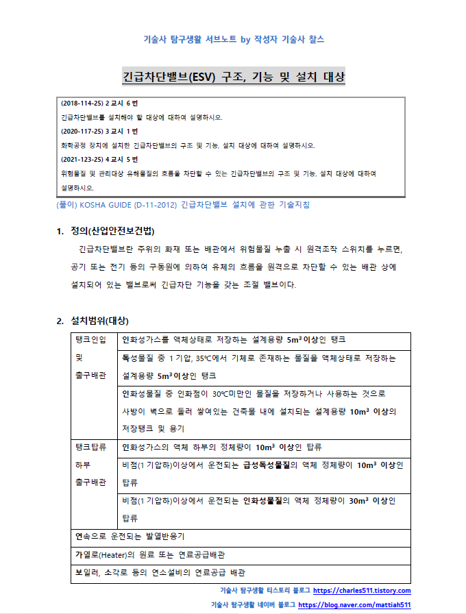 화공안전기술사의 시험문제에서 요구하는 것은 보통 KOSHA GUIDE를 기반으로 하는 문제가 자주 나오기 때문에 코샤가이드 상에서 다루는 있는 내용을 그대로 키워드를 따서 정리하시면 좋습니다.
