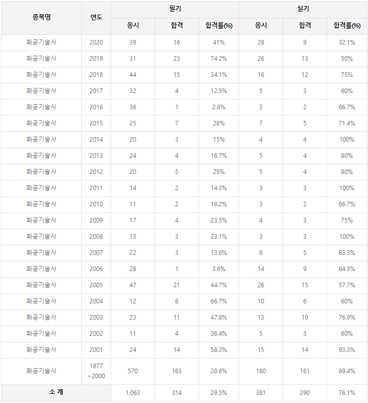 객관적으로 보아도 화공기술사는 화공안전기술사에 비해 상대적으로 필기 합격률이 높은 것으로 통계가 말해주고 있습니다.